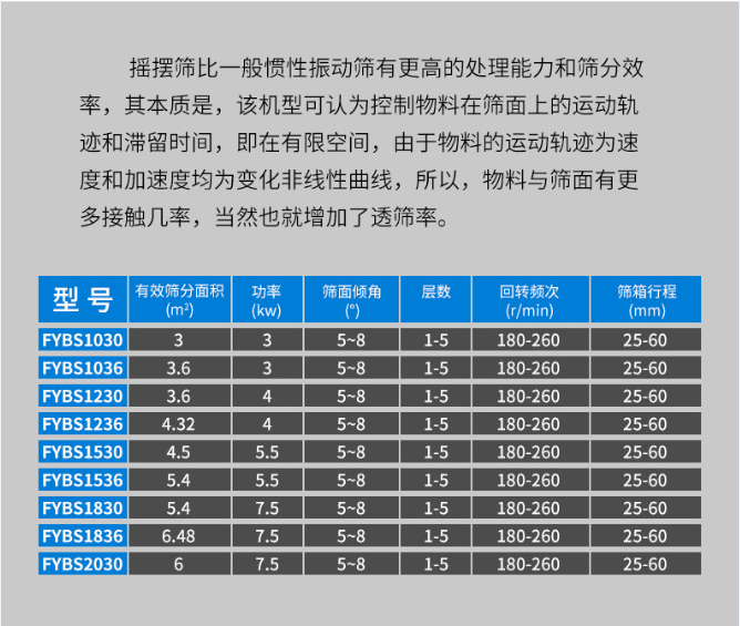 方形摇摆筛启动后,筛机摇动体即筛箱在惯性力的作用下作前后往复运动,筛箱带动筛面作周期性摇动,从而使筛面上的物料随筛箱- -同作定向跳跃式运动。期间小于筛面孔径的物料通过筛孔落到下层,成为筛下物,大于筛面孔径的物料经连续翻滚跳跃运动后从排料口排出,*终完成筛分工作。